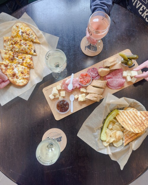 Guests can enjoy a selection of light bites right in Montezuma Winery’s tasting room, making it easy to pair your favorite wines with something delicious. Our kitchen menu features a variety of shareable and satisfying options, including naan pizzas, paninis, pretzels, charcuterie, and more — perfect for a casual snack or a relaxed bite while you sip.
